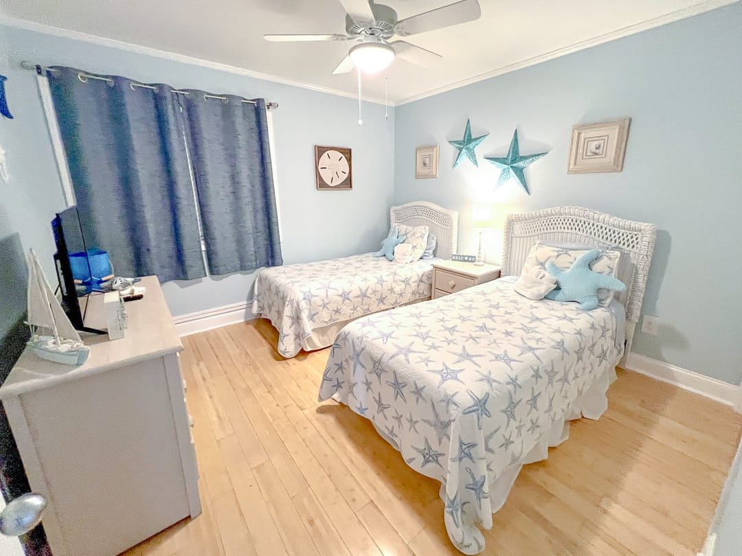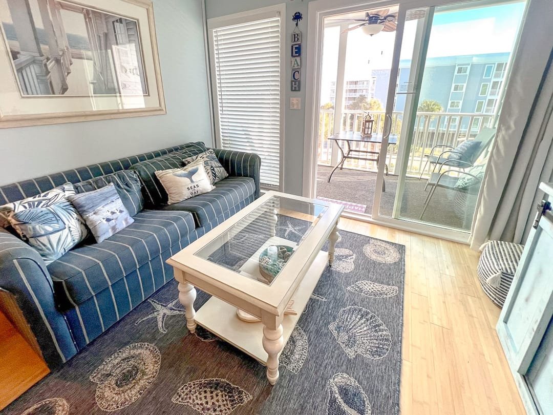 This 3 bedroom condo features an excellent view of Shore Drive, convenient access to the beach and 2 pools, and comfortable beach inspired decor. Sleeps 8 people with a King, queen and two twin beds and a new sleeper sofa.